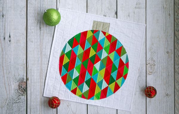 This colorful Christmas baubles quilt pattern would look beautiful on the bed or the wall. The mini quilt employs an 8-at-a-time method for creating the half-square triangles used in the design.