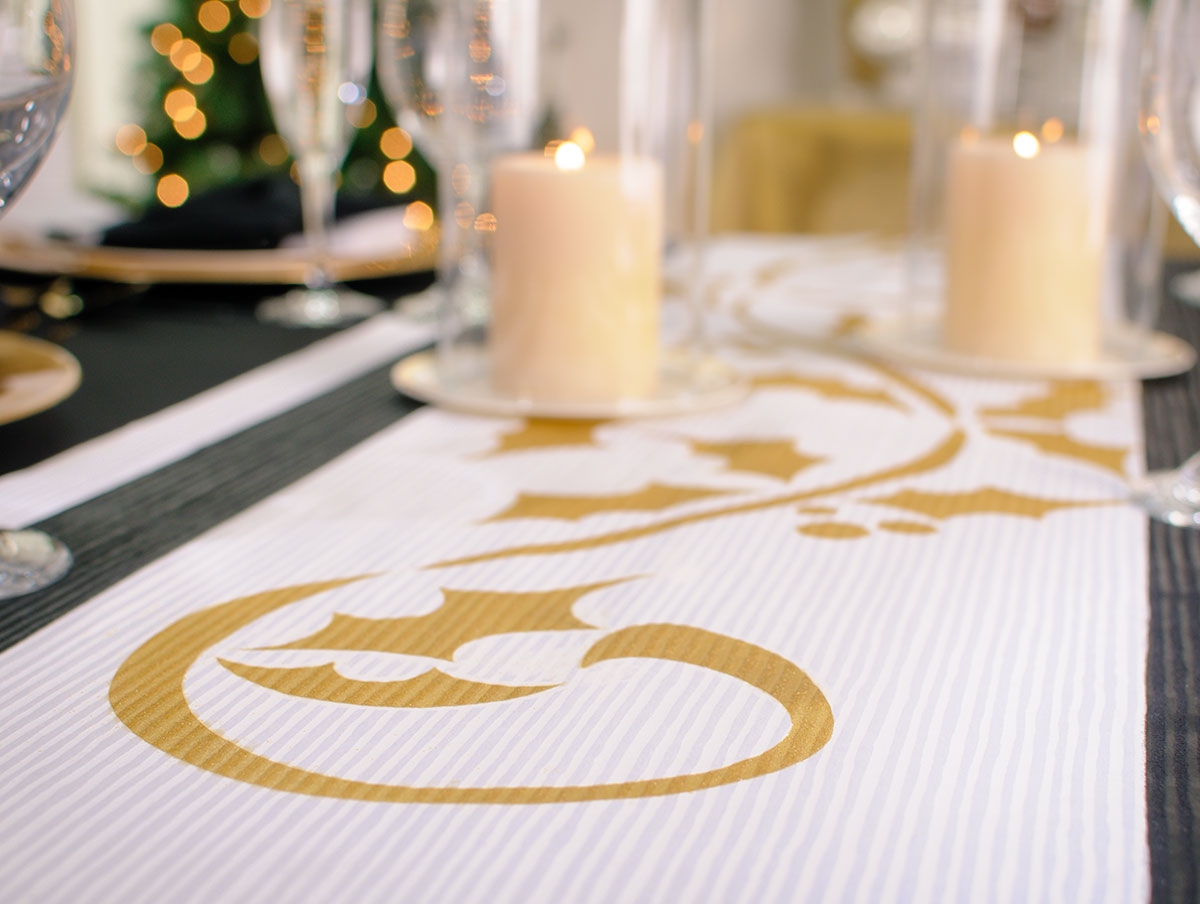 The perfect party décor hack done with a table runner displaying all the wonderful colors of Christmas.